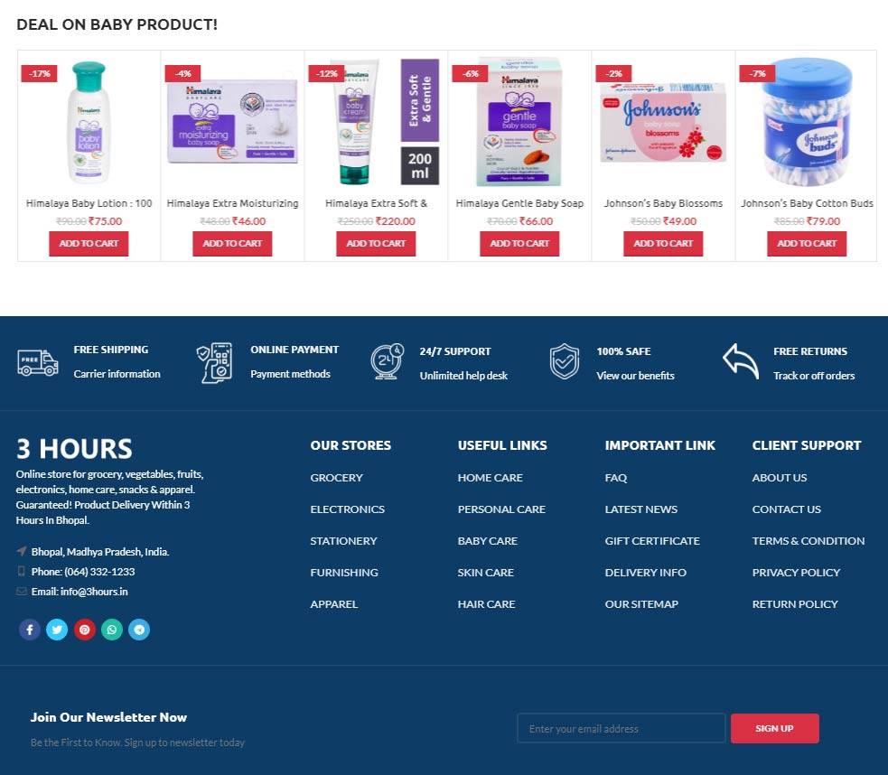 3 Hours are Bhopal based company specialised for delivery product within 3 hours in all over Bhopal, Madhya Pradesh. We provide services like grocery, vegetables, fruits, electronics, home care, personal care, snacks & apparel.